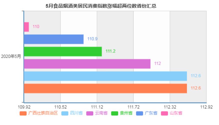 具体省份来看,广西、四川、云南、贵州、广州、山东等6省份食品烟酒类居民消费指数同比涨幅均超两位数,分别为12.6%、12.6%、12%、11.2%、10.9%、10%,值得注意是,上述6省份5月份CPI同比涨幅均超全国。