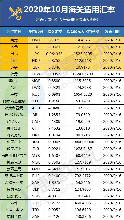 海关汇率 | 2020年10月海关适用汇率(2020年9月16日更新)