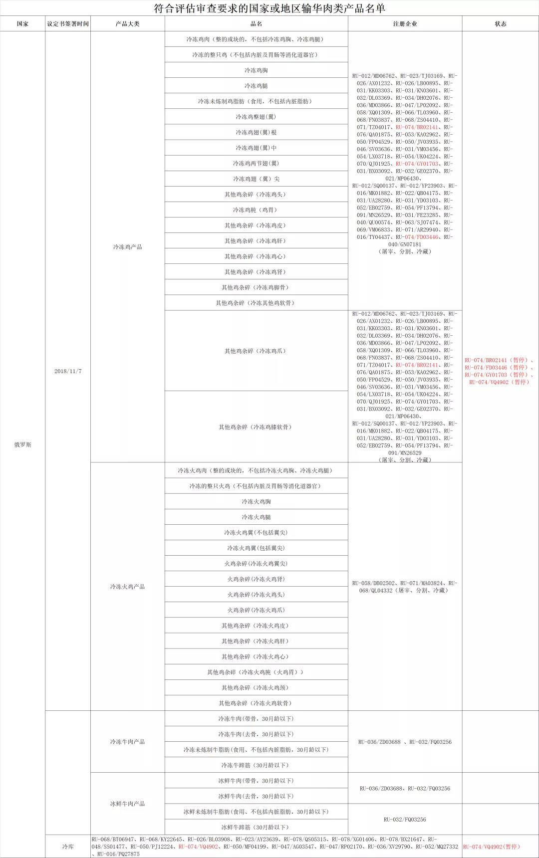 海关总署 |【准入更新】恢复俄罗斯1个州禽肉产品输华、暂停俄罗斯4个州禽肉产品输华(2020年9月25日)
