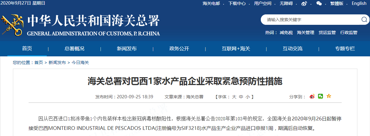 因从巴西进口1批冻带鱼1个内包装样本检出新冠病毒核酸阳性,根据海关总署公告2020年第103号的规定,全国海关自2020年9月26日起暂停接受巴西MONTEIRO INDUSTRIAL DE PESCADOS LTDA(注册编号为SIF3218)水产品生产企业产品进口申报1周,期满后自动恢复。