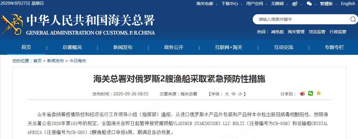 山东省委统筹疫情防控和经济运行工作领导小组(指挥部)通报,从进口俄罗斯水产品外包装和产品样本中检出新冠病毒核酸阳性,按照海关总署公告2020年第103号的规定,全国海关自即日起暂停接受捕捞船VLADIMIR STARZHINSKY LLC ROLIZ(注册编号为CH-05M)和运输船CRYSTAL AFRICA(注册编号为CH-56N)2艘渔船进口申报4周,期满后自动恢复。