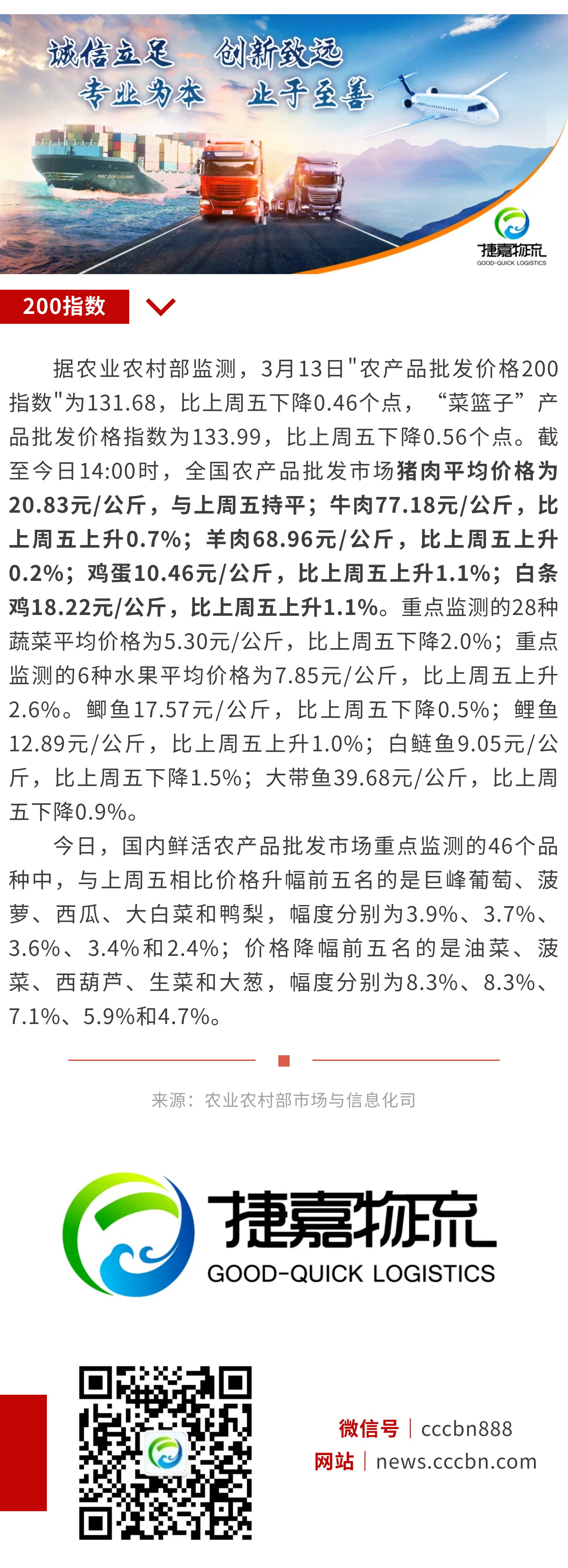 3月13日:"农产品批发价格200指数"比上周五下降0.46个点