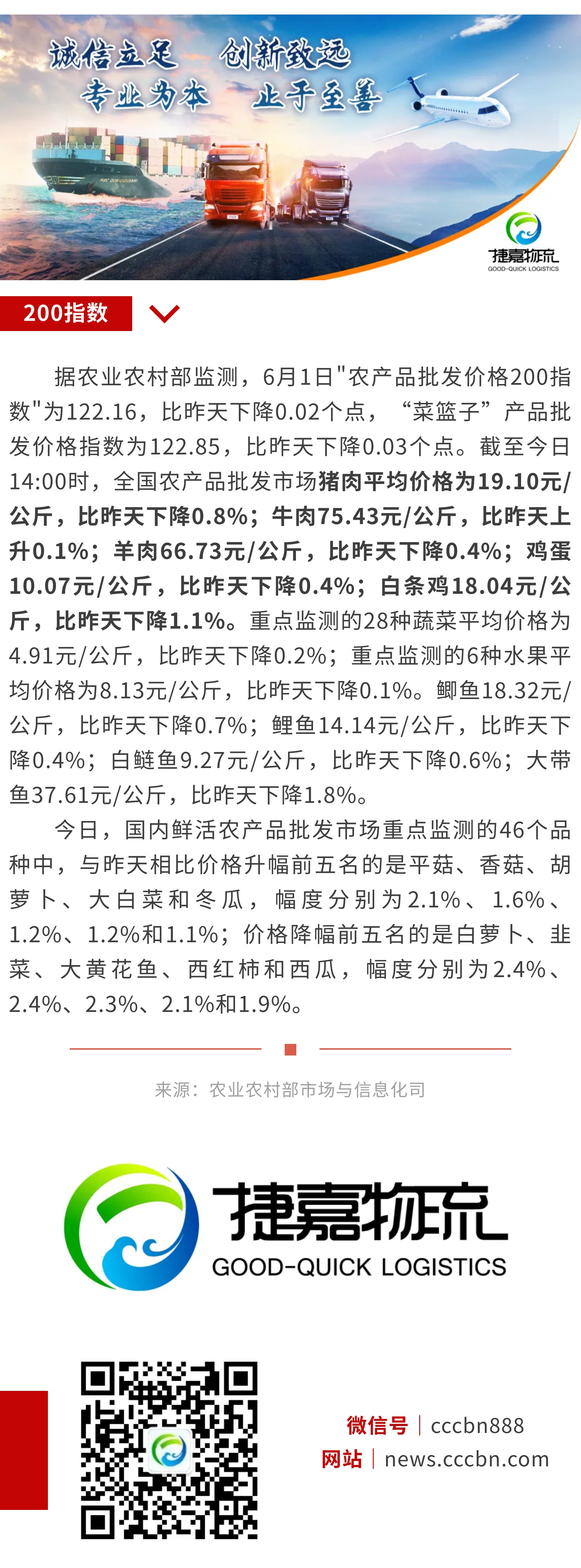 6月1日:"农产品批发价格200指数"比昨天下降0.02个点
