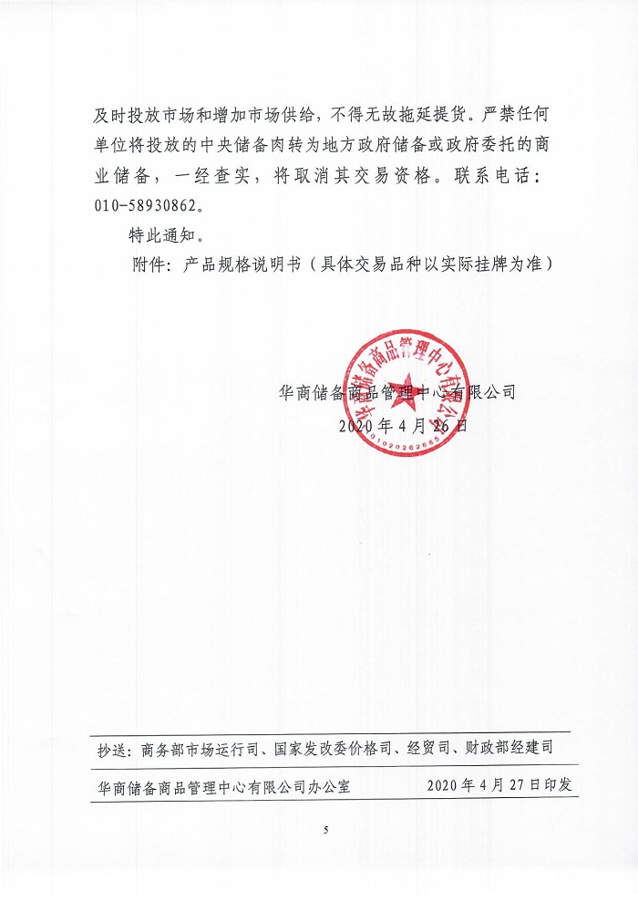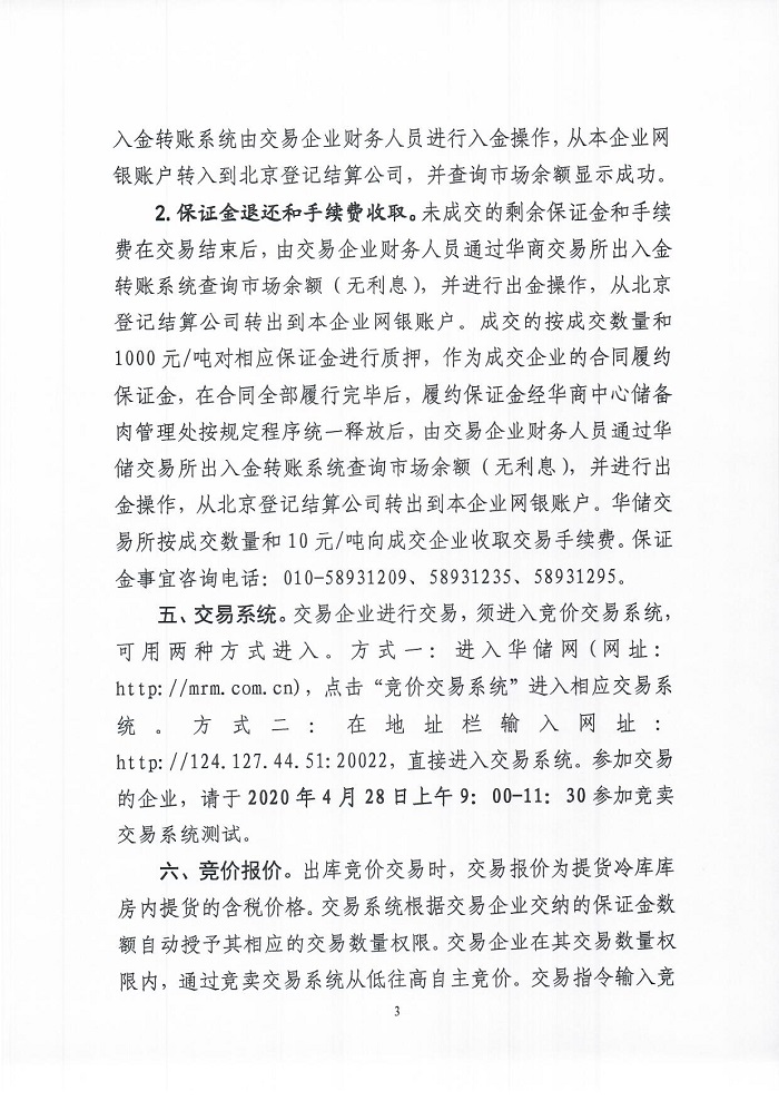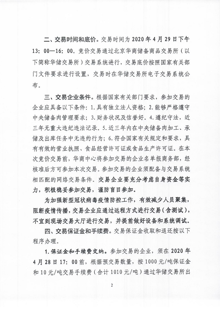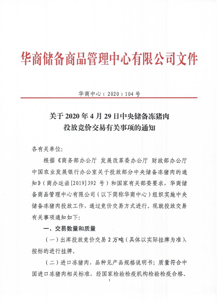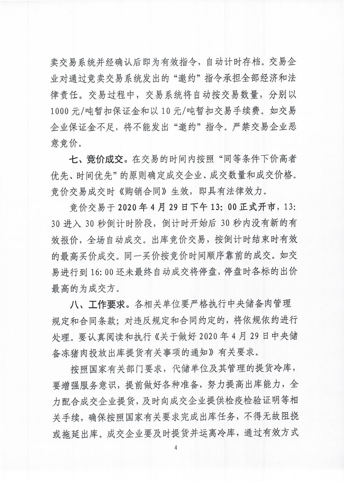 关于2020年4月29日中央储备冻猪肉投放竞价交易有关事项的通知