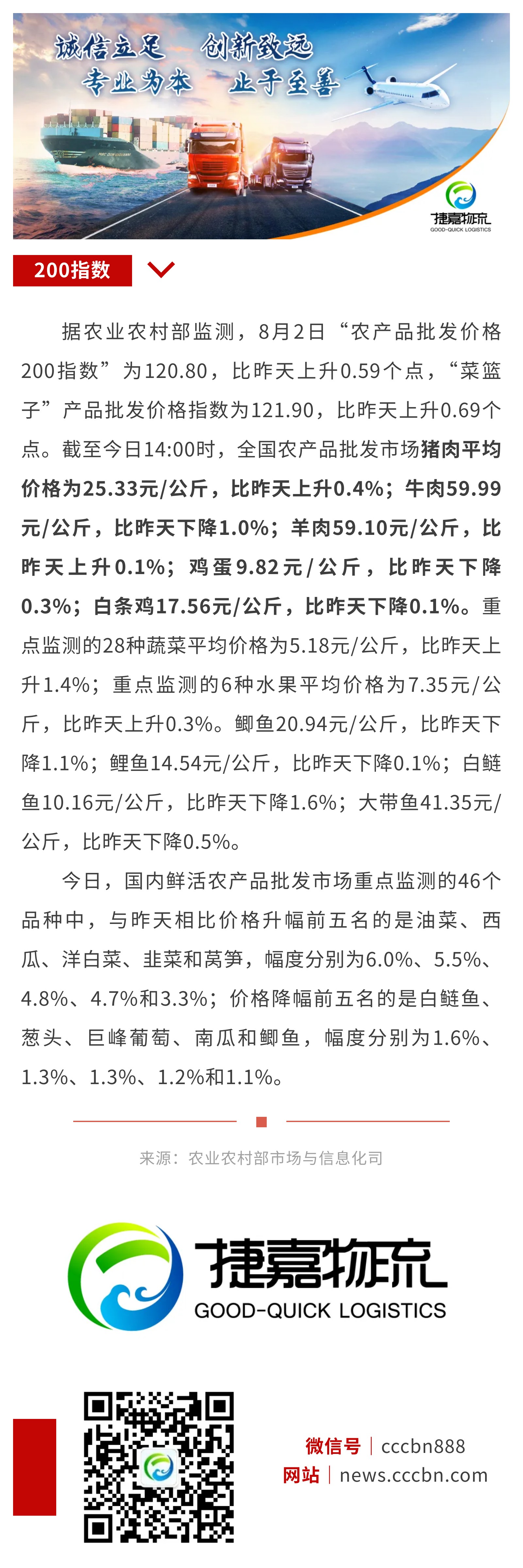 8月2日:“农产品批发价格200指数”比昨天上升0.59个点