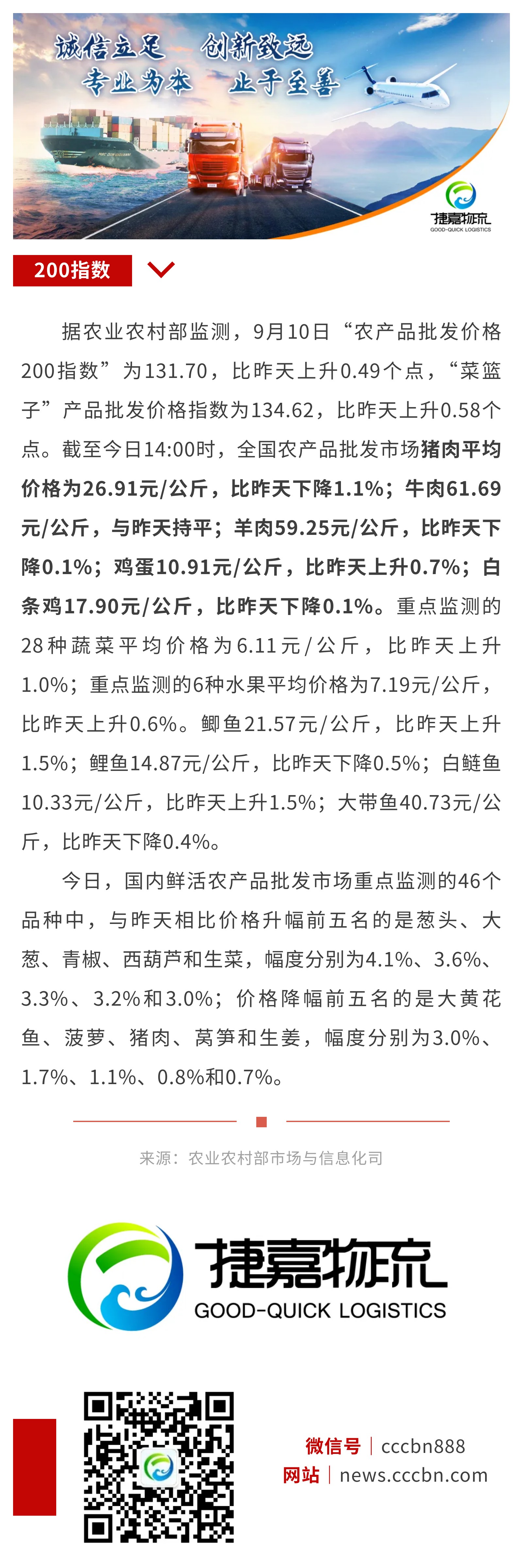 9月10日:“农产品批发价格200指数”比昨天上升0.49个点