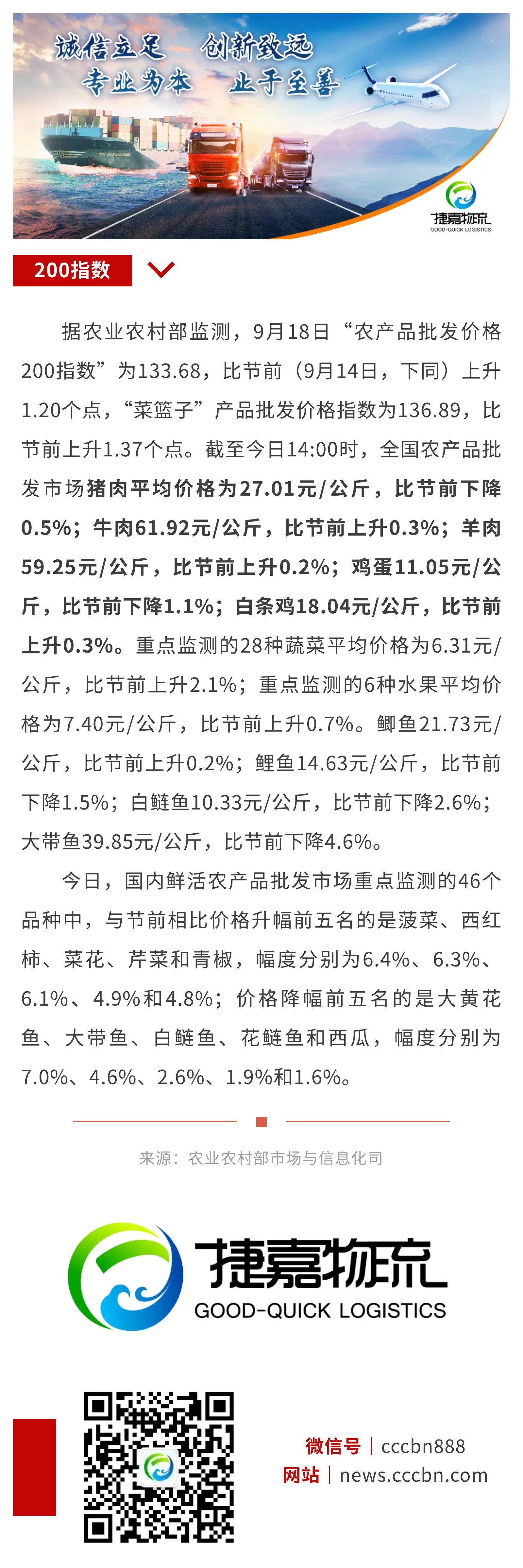 9月18日:“农产品批发价格200指数”比节前上升0.18个点