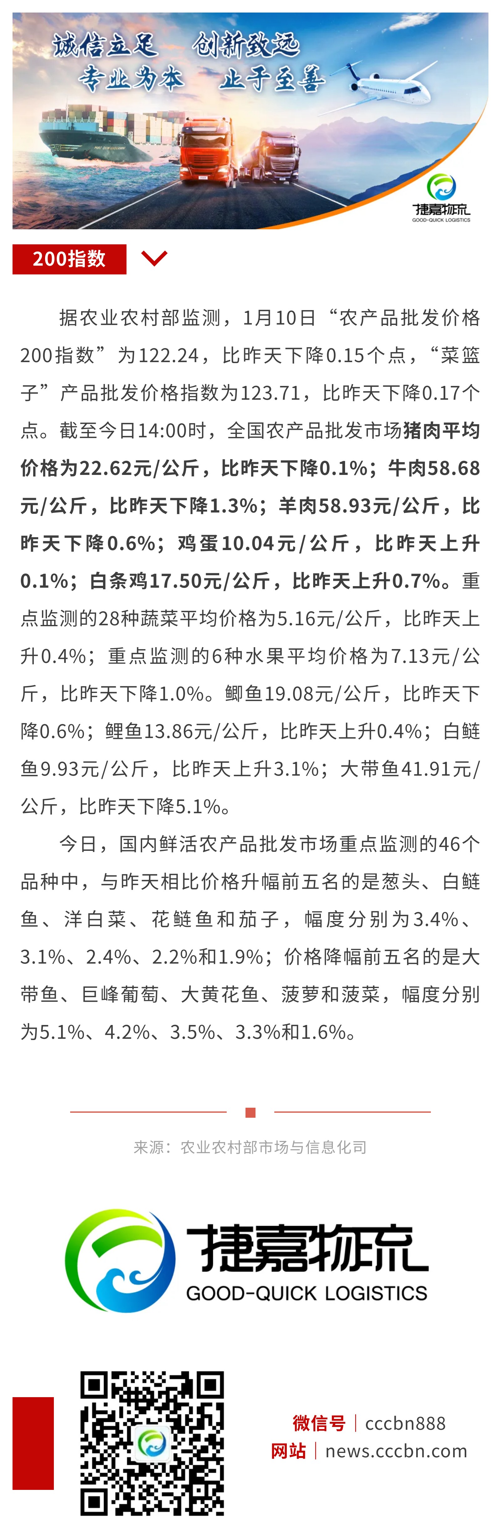 1月10日:“农产品批发价格200指数”比昨天下降0.15个点