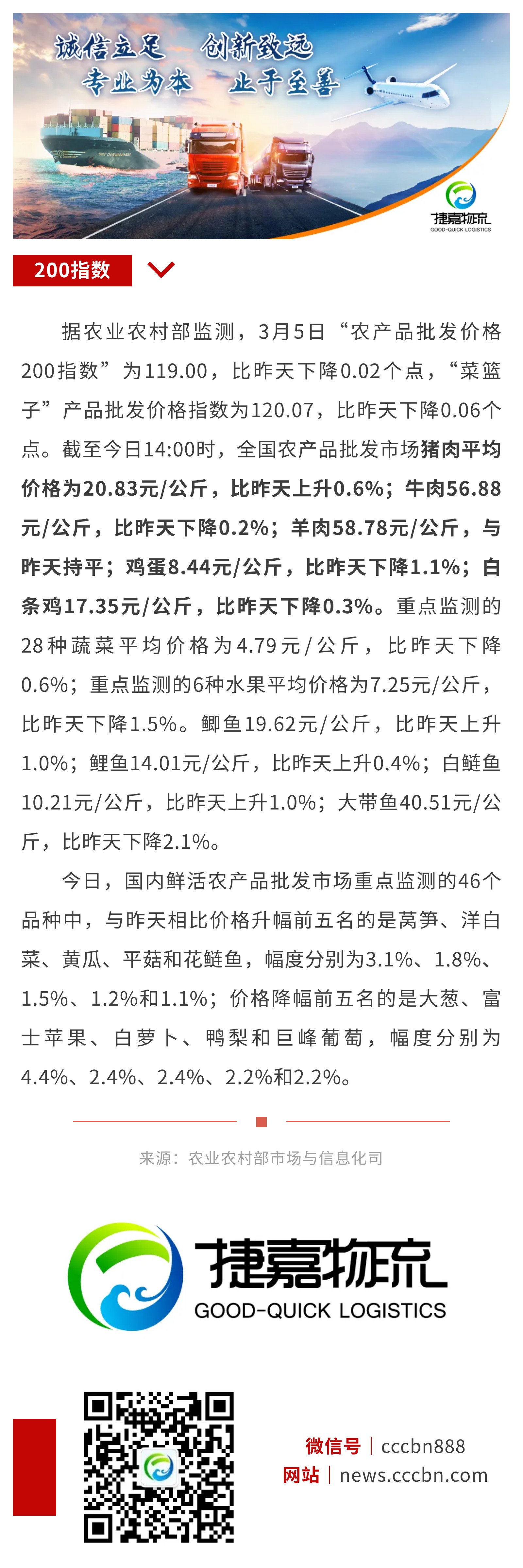 3月5日:“农产品批发价格200指数”比昨天下降0.02个点