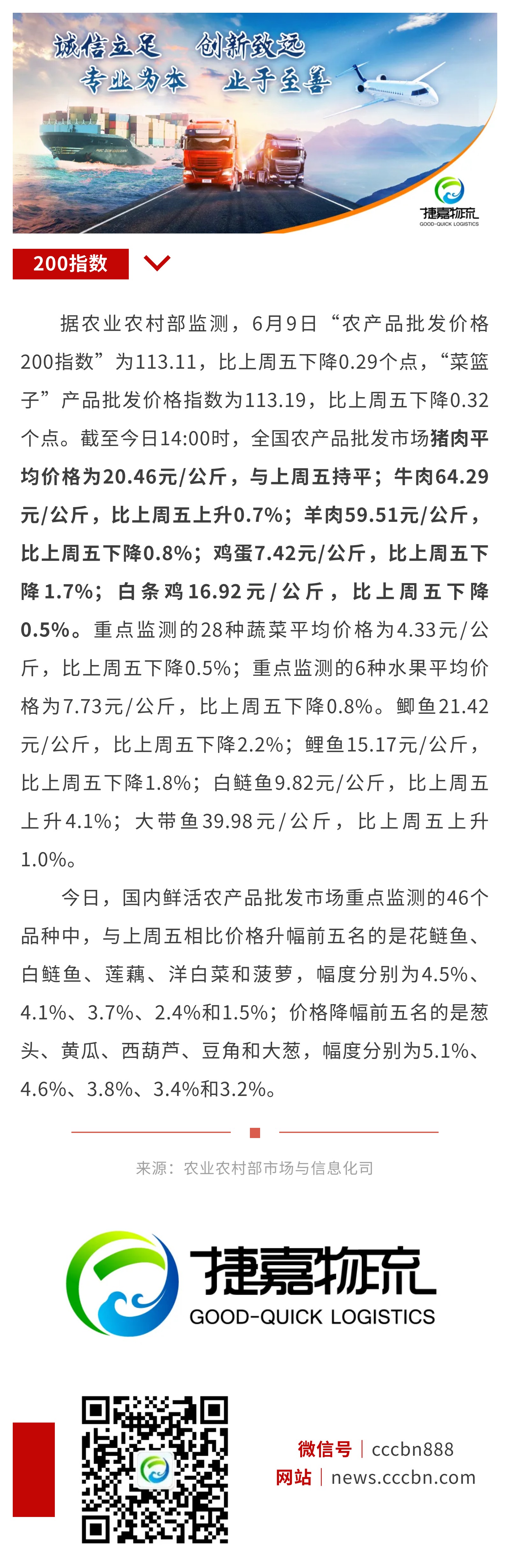6月9日:“农产品批发价格200指数”上周五下降0.29个点