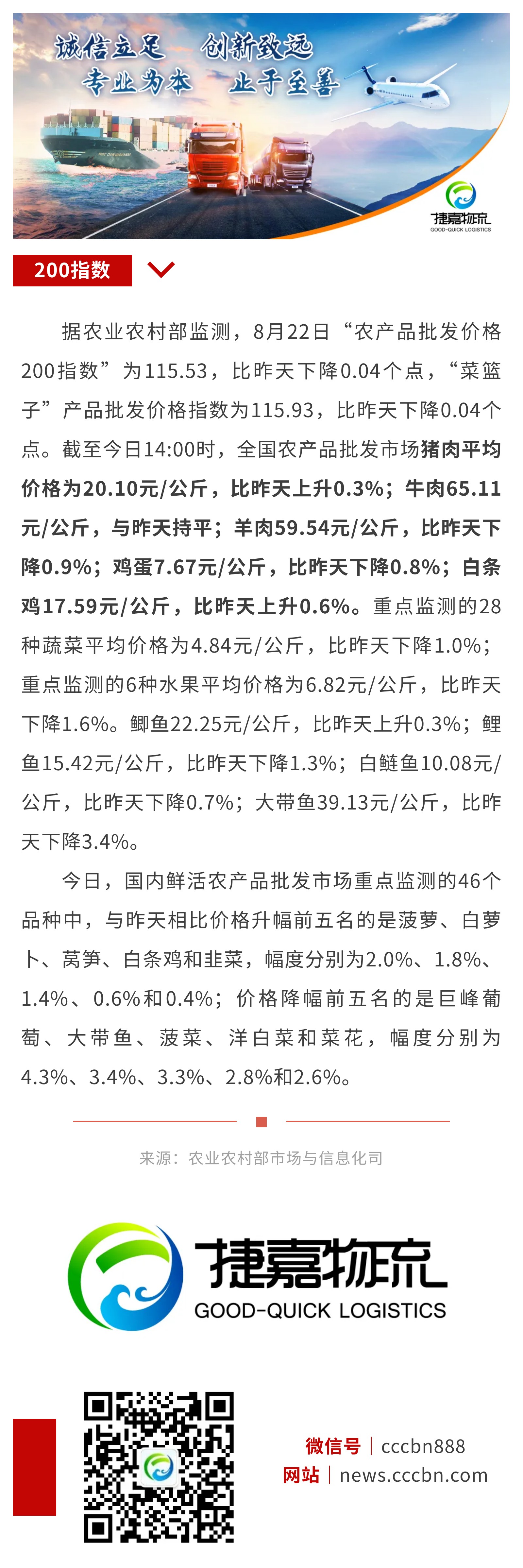 8月22日:“农产品批发价格200指数”比昨天下降0.04个点