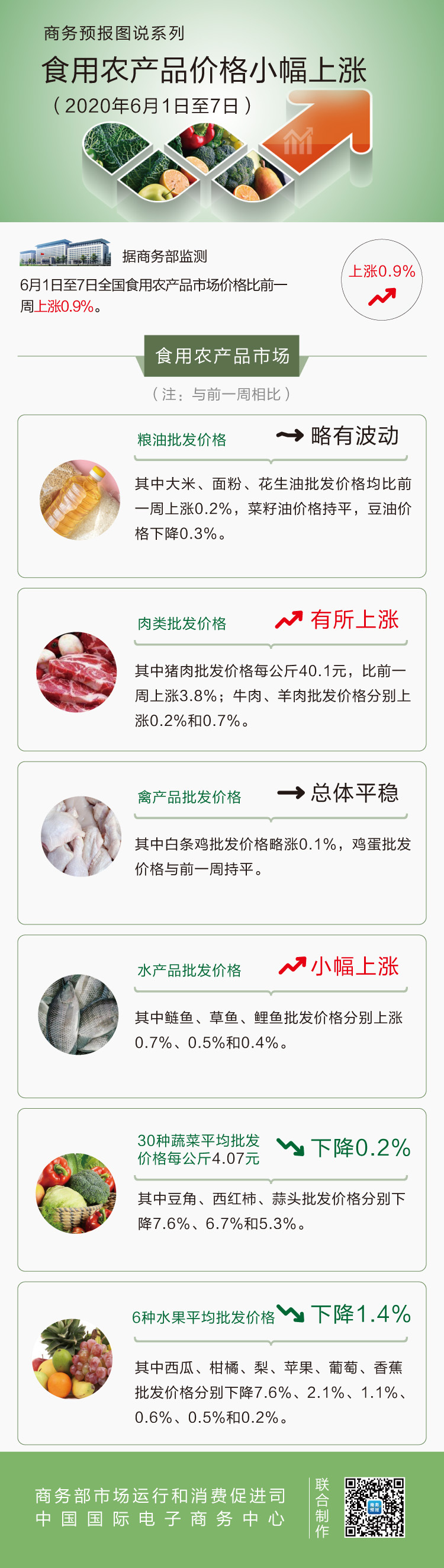 据商务部监测,6月1日至7日全国食用农产品市场价格比前一周上涨0.9%。